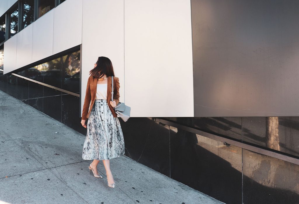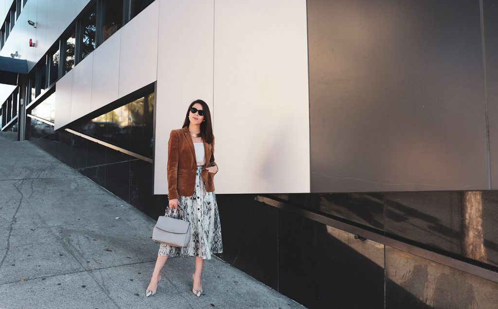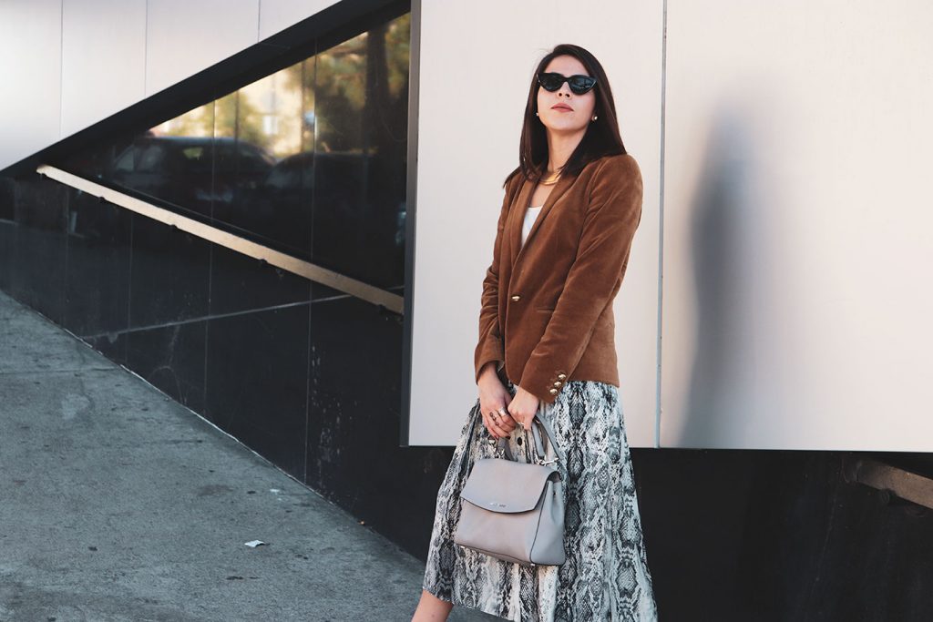 The third part of “One Garment, 4 Ways To Wear It” wearing the same snake print skirt with shoes in the same snake print. What I love about this trend is that you can take the risk of mixing the print with bright colors and same print from head to toe.