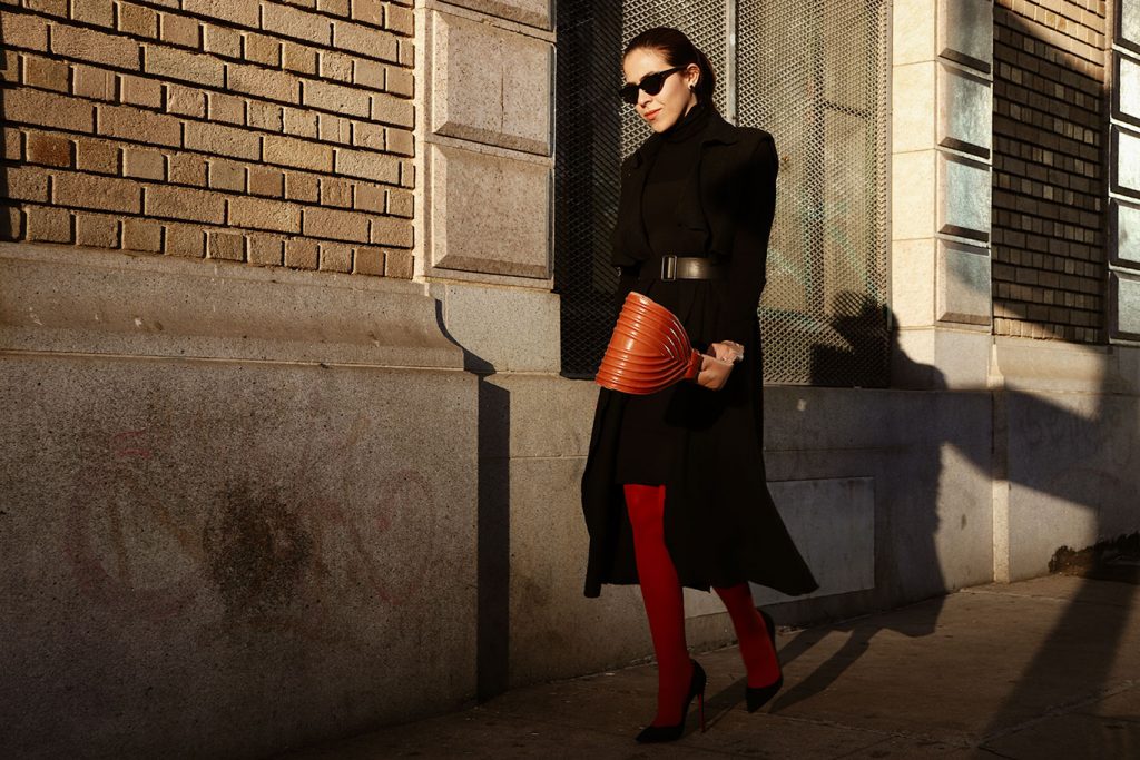 To make the transition the sleeveless little black dress, to a total fall look. I wore it with the orange tights that became the main point of the look. A black turtleneck top, a black sleeveless duster. As usual in my personal style, a belt to narrow the silhouette.